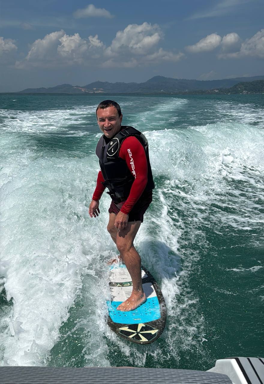 🏄‍♂️Вчера я катался на вэйксерфе — это когда катаешься на волне за катером! Я получил просто офигенный заряд эмоций и кайфа!