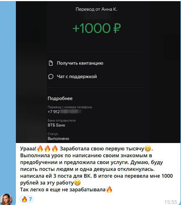 🍀 Отлично! Наша ученица Татьяна только записалась на курс и начала предобучение, а уже успела заработать 1000 рублей! Это невероятный результат, который демонстрирует эффективность нашей программы и стремление учеников к успеху. Мы гордимся Татьяной и ее первыми шагами в новой профессии.