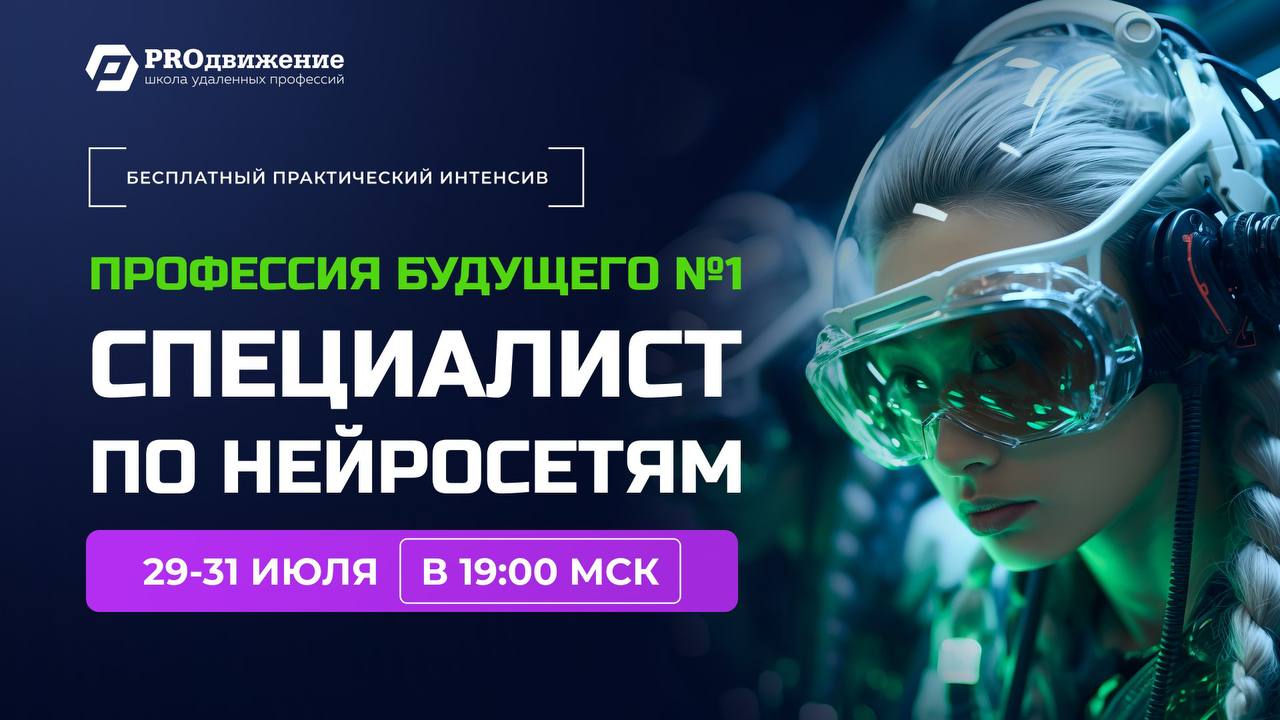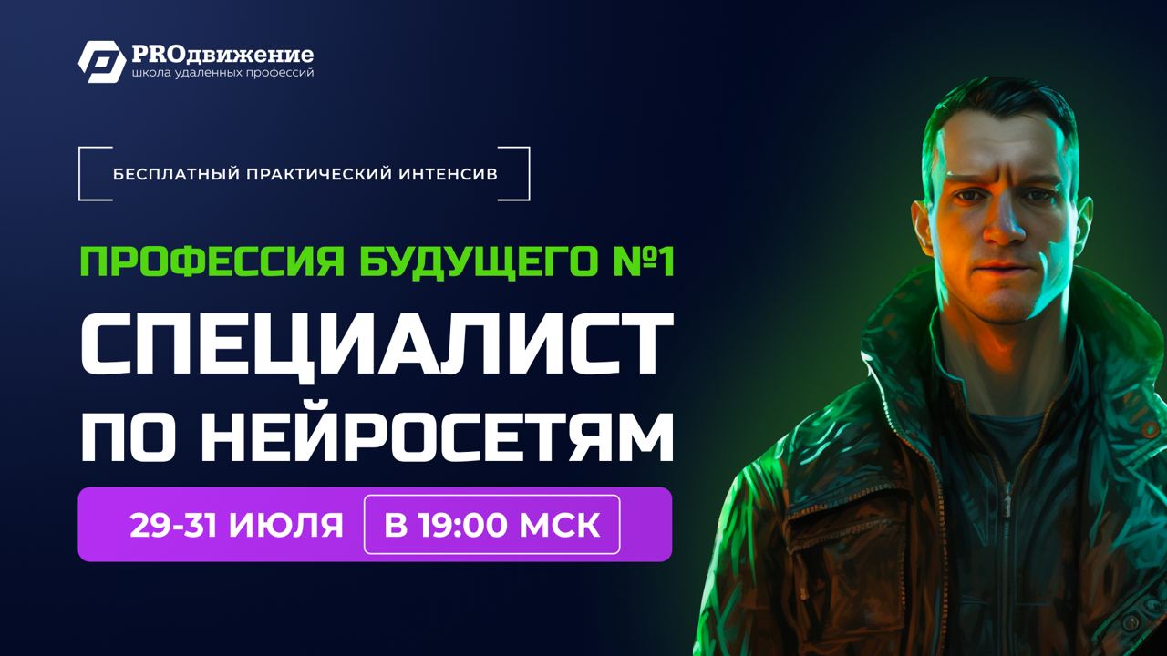 29-31 июля в нашей школе пройдет бесплатный практический интенсив «Профессия будущего №1 “Специалист по нейросетям”»! Это ваш шанс получить актуальные знания и навыки, которые откроют перед вами новые горизонты!