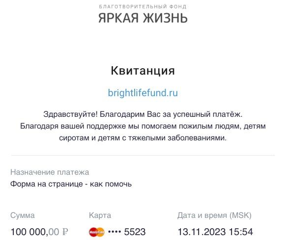 🙏Выбрали благотворительный фонд «Яркая жизнь». Этот фонд уже 12 лет доказывает свою эффективность и прозрачность, помогая тем, кто оказался в самой уязвимой ситуации: одиноким пожилым людям, детям с тяжелыми заболеваниями и детям-сиротам. Мы не просто перевели средства наугад.