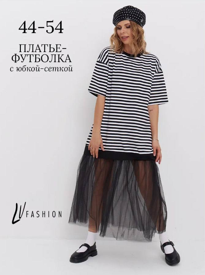 Animate the image, leaving all text and graphic elements, background, style and layout unchanged. The only animated element is the girl in the striped dress. Add smooth animation: the girl smiles and spins, holds the skirt of the dress with her hands. Important: everything else - inscriptions, logos, colors and background - remains completely static.